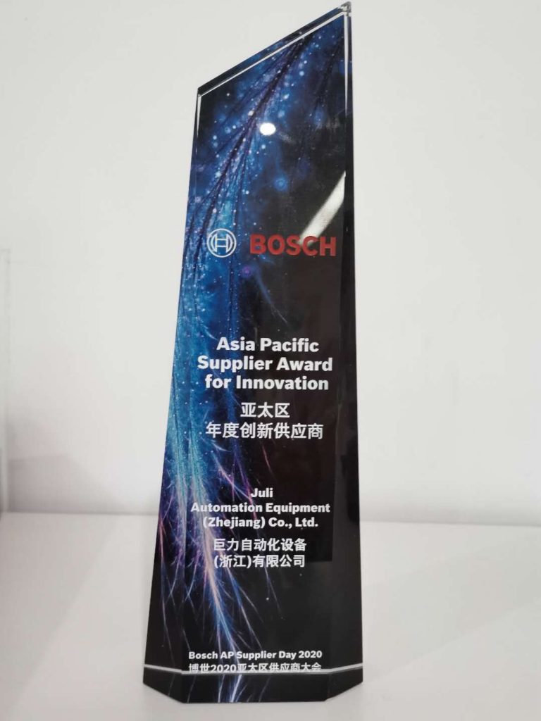 在《博世2020亞太區(qū)供應(yīng)商頒獎儀式》上,巨力自動化公司獨占鰲頭,從多供應(yīng)商中脫穎而出,獲得了此次博世集團頒布的亞太區(qū)供應(yīng)商《亞太區(qū)年度創(chuàng)新供應(yīng)商》獎項。